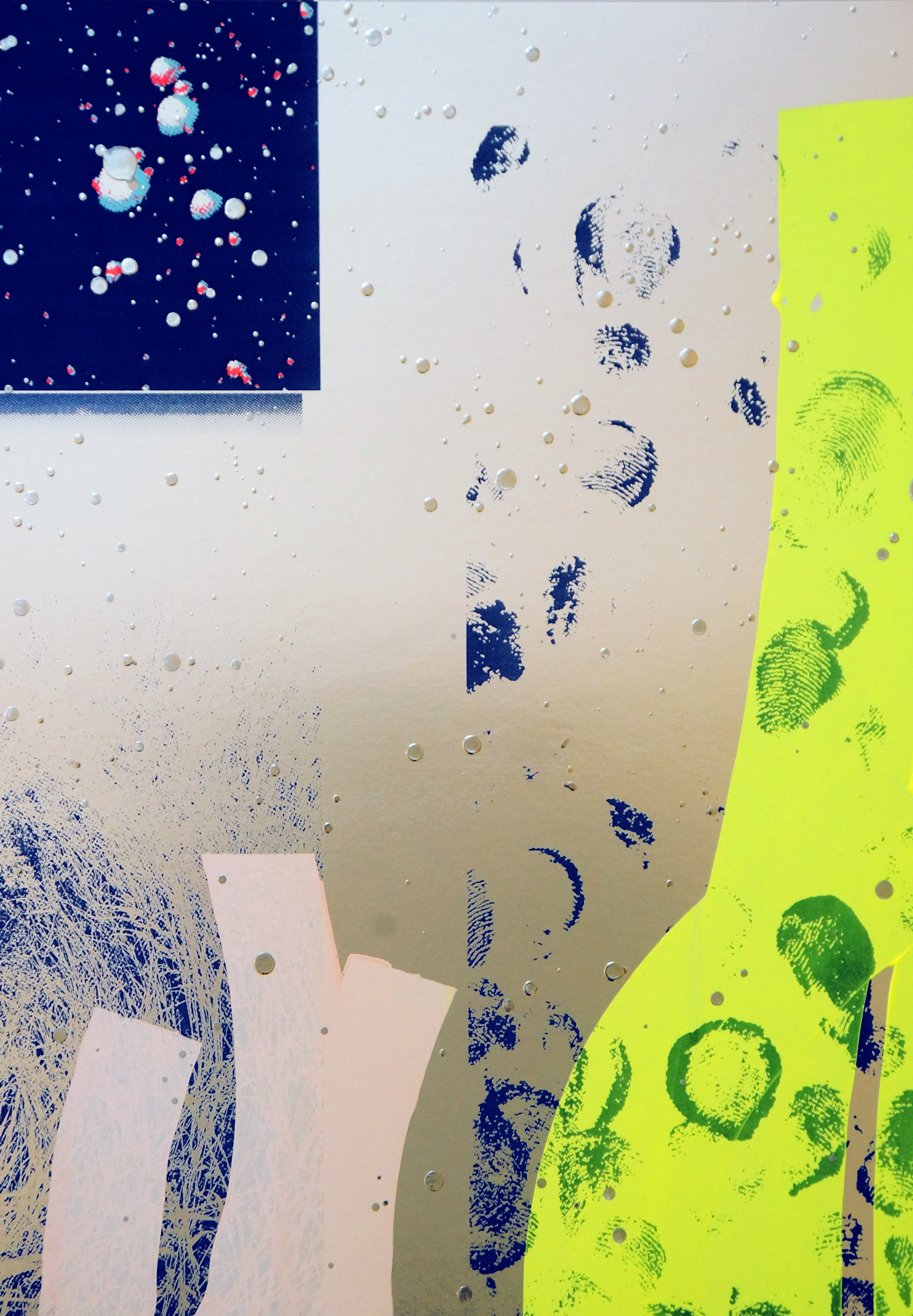 L'IMAGE CONTIENT PEUT-ÊTRE UN APRÈS-MIDI „Editions de sérigraphies monochrome fluo, dégradé pêche et métal sur papier doré 50x70cm, 2023.