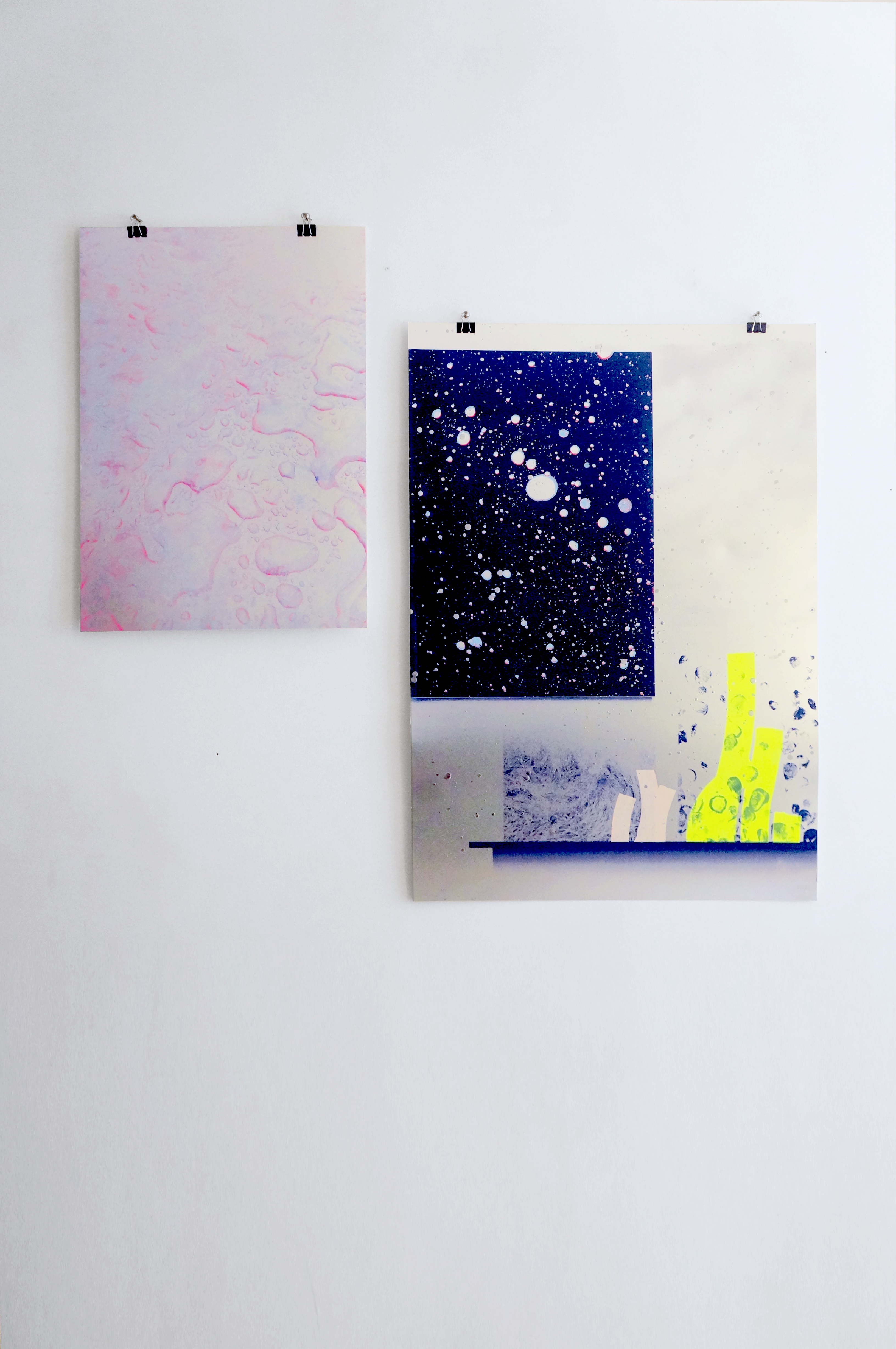 L'IMAGE CONTIENT PEUT-ÊTRE / UNE PRAIRIE POUR DEUX / JUICY TEARS / STORY BOARD Pièces de sérigraphies réalisées dans le cadre d'une résidence de création à l'Atelier Le Bouc - Estampes, Images imprimées et design graphique - avec pour sujet l'image et le paysage, traité, raconté, produit via la romance. Et inversement.
