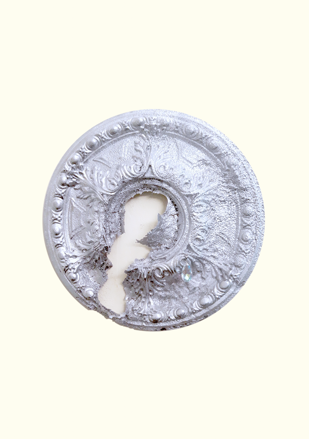 Amandine Pierné-PETERMANN // ALIEN HEART // Rosace polystyrène, peinture chrome et pampille, ø50cm, 2025.