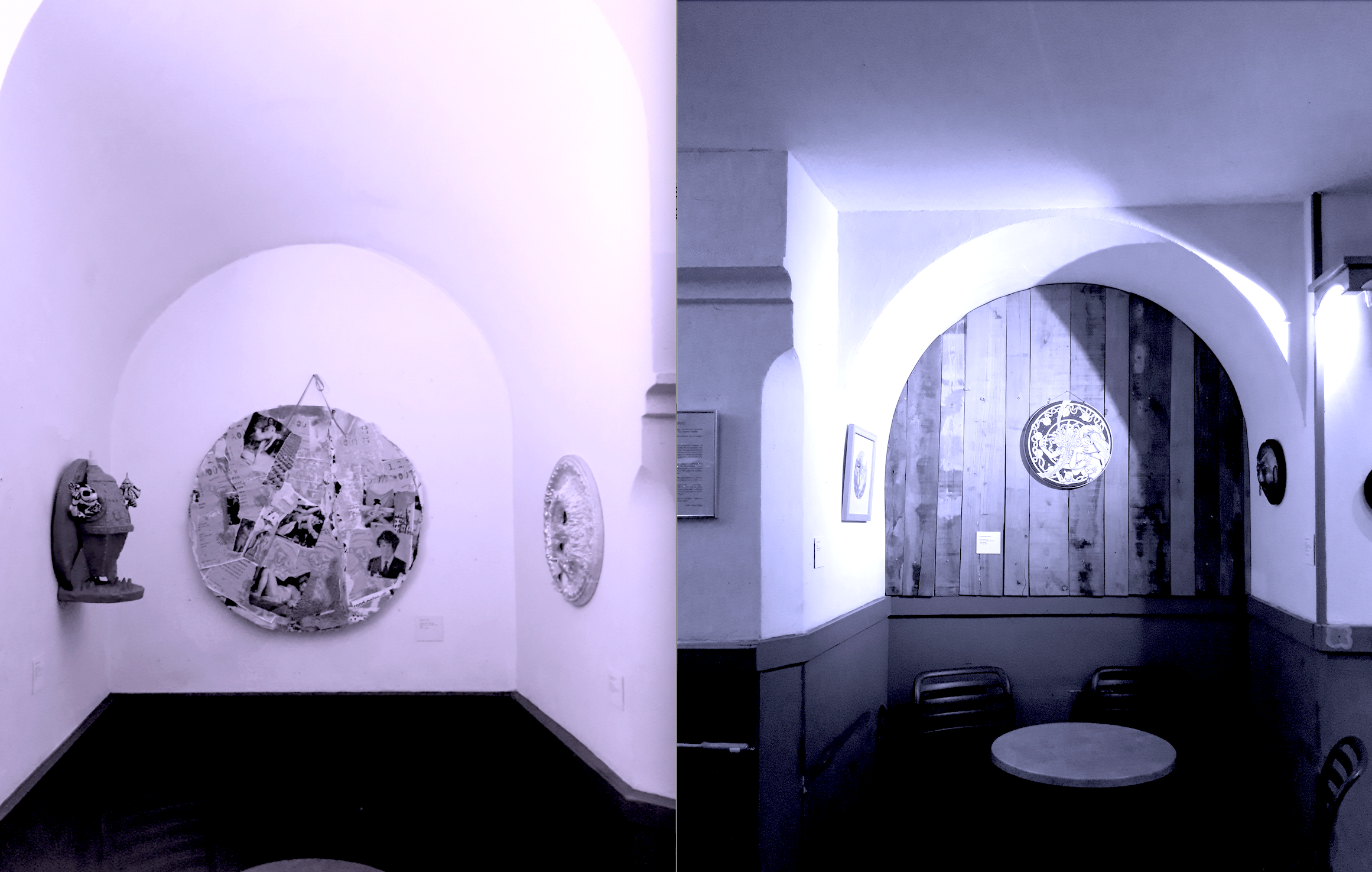 Tondo : Œuvre peinte, parfois sculptée, sur un support de forme ronde. Love me true. Le Tondo est un type d’œuvre exigeante à exposer en terme d’accrochage. Elle réclame silencieusement mais fermement un traitement spécial : être placée à distance d’autres œuvres - seule, c’est encore mieux - et en particulier des œuvres à angles droits, formatées, en-cadrées, par/pour un environnement construit et plus faciles à associer entre elles. Accroché en hauteur, un Tondo rappelle obstinément un corps céleste. Placé au niveau de l’observateur, il ne se comporte pas comme un tableau-fenêtre, mais un objet-en-face dont l’identité variera à l’infini selon le contenu, la taille et la raison de sa forme. Astre-île, macro-micro, monade leibnizienne, sa rondeur est synonyme de perfection, d’autonomie, d’être en/pour soi. Le Tondo serait alors en quelque sorte un je suis «cela», «cet ici», «ce pourquoi» singulier. Un entier avec sa propre nature (l’œuvre à angles droits en serait plutôt la mise en paysage), identité, logique et dynamique interne. Un objet-monde dans un monde d’objets. «Love me tondo» signifie dans ce contexte «aime-moi tel·le que je suis», «aime-moi tout rond». Les œuvres sont triangulées sur deux alcôves. L'une autour de la matière, planétaire, papier déchiré, mâché, matériau rongé, comme un voyage agencé. (Tondo de Pierre J. Truc centré, celui d'AnimalaGgrier et le mien se faisant face). L'autre autour du corps, ondulé, aux visages, yeux, tétons, plis, trous et scarifications, reliés en pointillés. (Tondos de Line Pauvert ("Vénus") et Aurélien Vallade ("Lune") en face à face avec au centre celui de Zoran Makowec) APP / Show Show